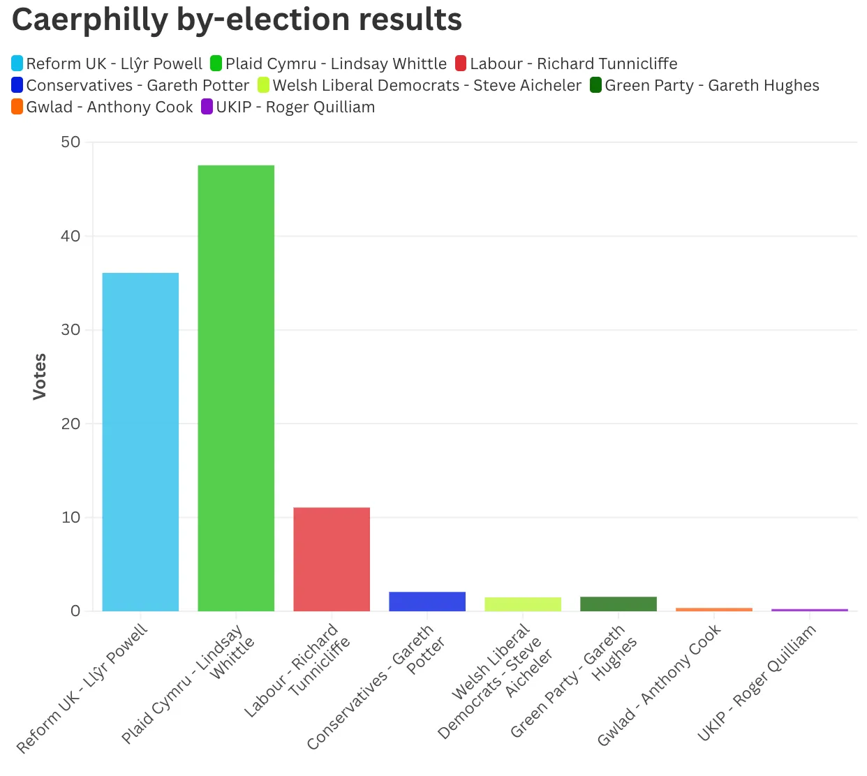 Labor and Tories badly beaten in Caerphilly byelection. It was basically Reform UK vs Plaid Cymru (Welsh National Party) - immigratiob vs local issues.